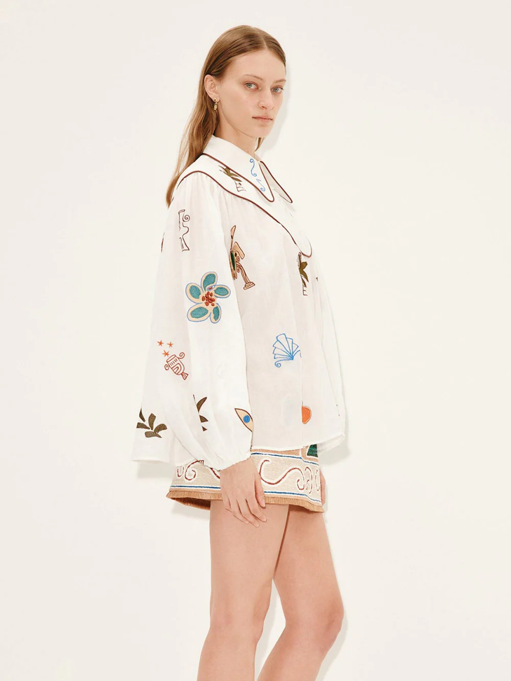 Blouse Mina signée Alémais confectionnée en lin blanc brodé de dessins sur le thème du Maroc, dessinés par l'artiste Laurence Leenaert. On retrouve notamment des chameaux ou encore des palmiers.