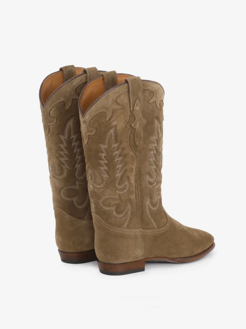 Les bottes Santiag Midnight de la marque Shiloh Heritage confectionnées en daim marron clair. Des bottes mi-mollet entièrement fabriquées à la main.