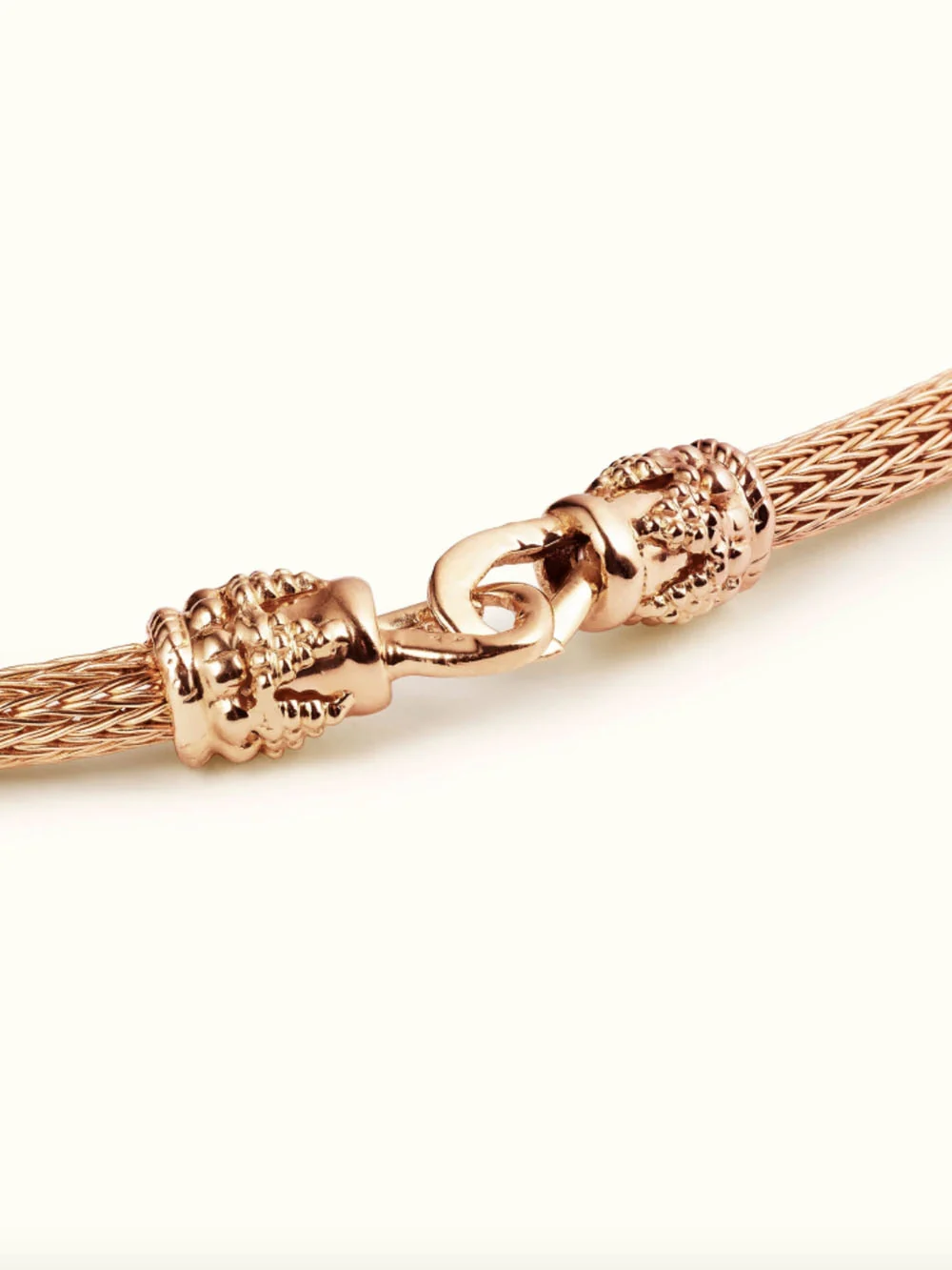 Chaine Indian or rose Marie Lichtenberg. Cette chaine en maille serpent est réalisée en or rose 14 carat. Elle dispose de menottes sur lesquelles peuvent se clipser les lockets Marie Lichtenberg. Chaque chaine Indian chocker est livrée dans sa boßte en papier mùché peinte à la main.