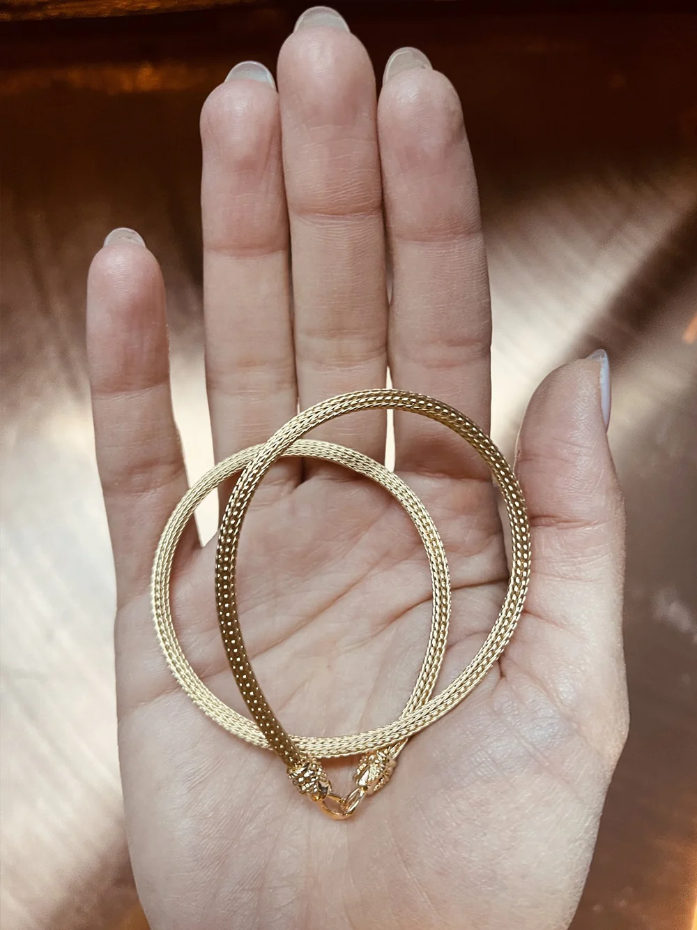 Chaine Indian Chocker Marie Lichtenberg. Cette chaine en maille serpent est réalisée en or 14 carat. Elle dispose de petits mousquetons sur lesquels peuvent se clipser les lockets Marie Lichtenberg. La chaine se porte en simple tour. Chaque chaine Indian chocker est livrée dans sa boîte en papier mâché peinte à la main.