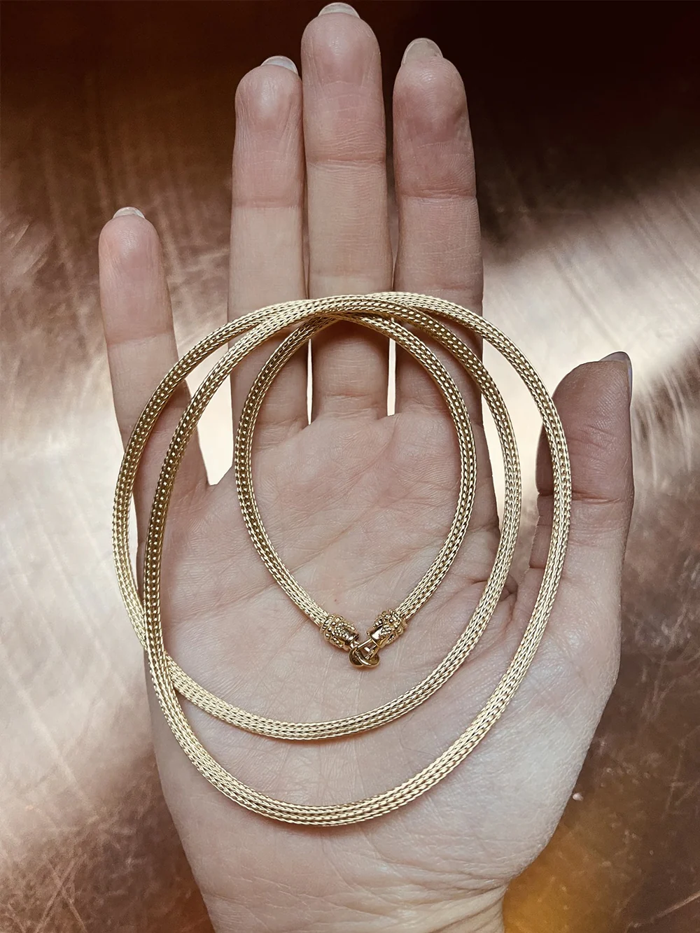 Chaine Indian Double Marie Lichtenberg. Cette chaine en maille serpent est réalisée en or 14 carat. Elle dispose de petits mousquetons sur lesquels peuvent se clipser les lockets Marie Lichtenberg. La chaine peut se porter en double tour. Chaque chaine Indian chocker est livrée dans son écrin de joaillerie.