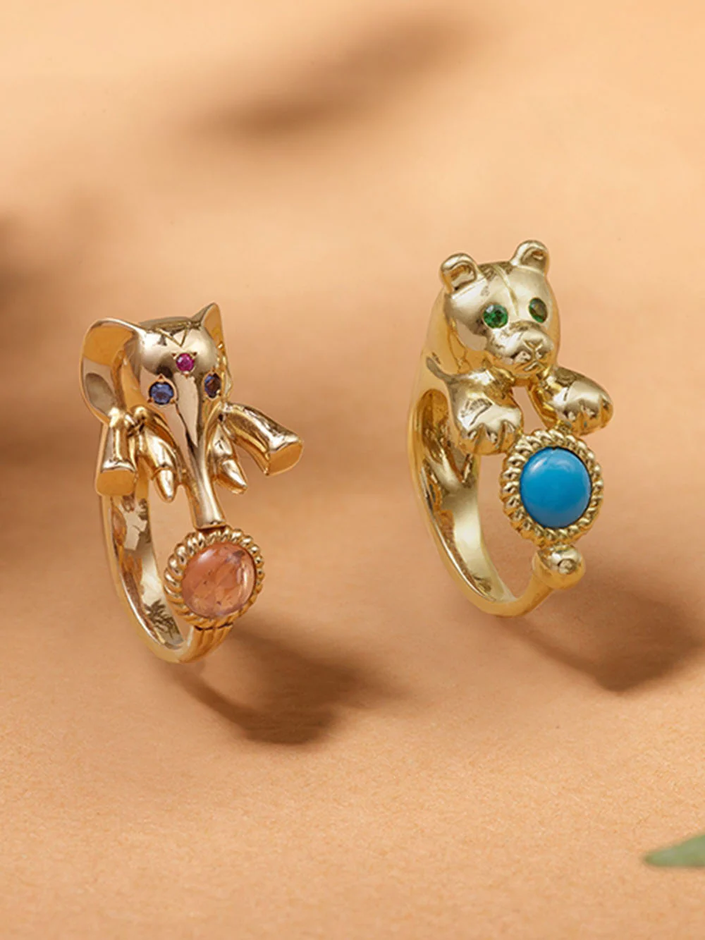 Cette chevaliÚre Cloclo Eléphanteau Salomé Rico en or rose 18 carats, est ornée de deux saphir bleu lavande en guise d'yeux et un saphir rose rappelant le Bindi indien. Elle est aussi accompagnée d'un cabochon en tourmaline rose.