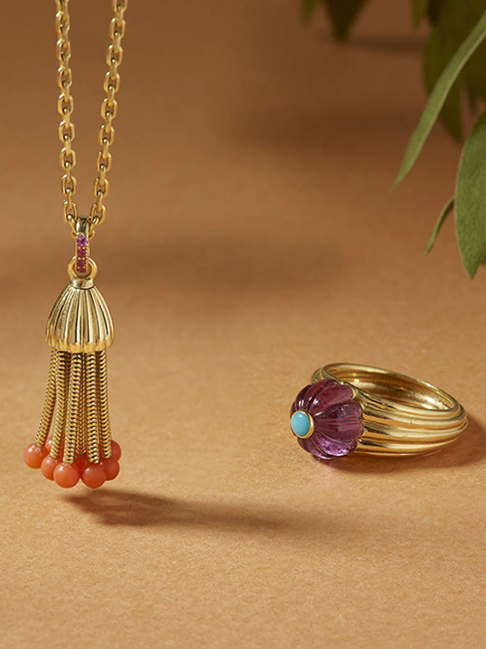Collier Jaseron Polpo Salomé Rico. Ce collier se compose d'une chaine maille jaseron sur laquelle sont soudés deux pendentifs Polpo, un en turquoise et un en corail. Les Polpo sont ornés de beads colorés et de pierres précieuses.