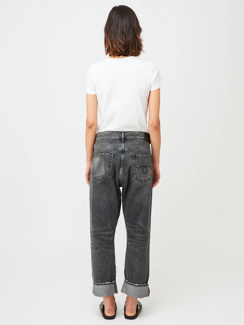 Jean Cross Over R13. Ce jean est doté d'une taille asymétrique et croisée qui forme un V flatteur. Il se ferme à l'aide d'un bouton. La piÚce est réalisée en denim italien rigide qui a été délavé et vieilli pour rappeler un modÚle vintage. Le jean présente des jambes larges qui se terminent sur des ourlets.