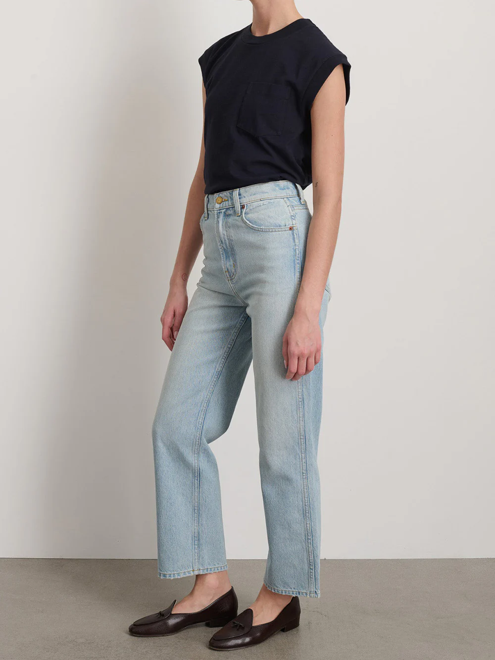 Le jean Plein couleur Super Light Vintage de la marque BSIDES, en denim bleu clair a une coupe droite avec une taille haute, des jambes légèrement évasées et raccourcies aux chevilles. Cette pièce est conçue à New York et fabriquée de manière responsable à Los Angeles.