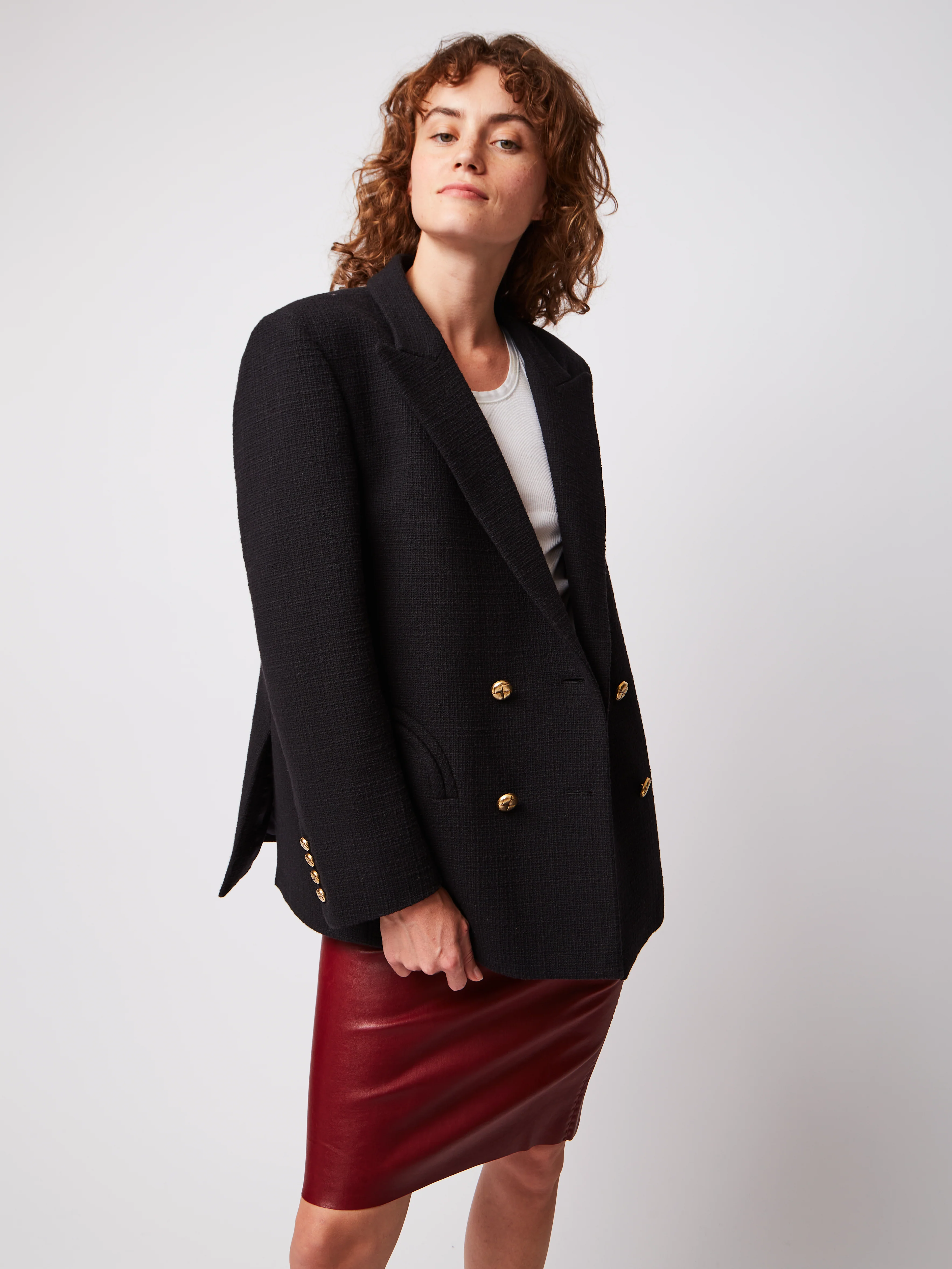La jupe Gilda signée Stouls est confectionnée dans un cuir plongé rouge. Une jupe coupe crayon avec une longueur midi, élégante et féminine.