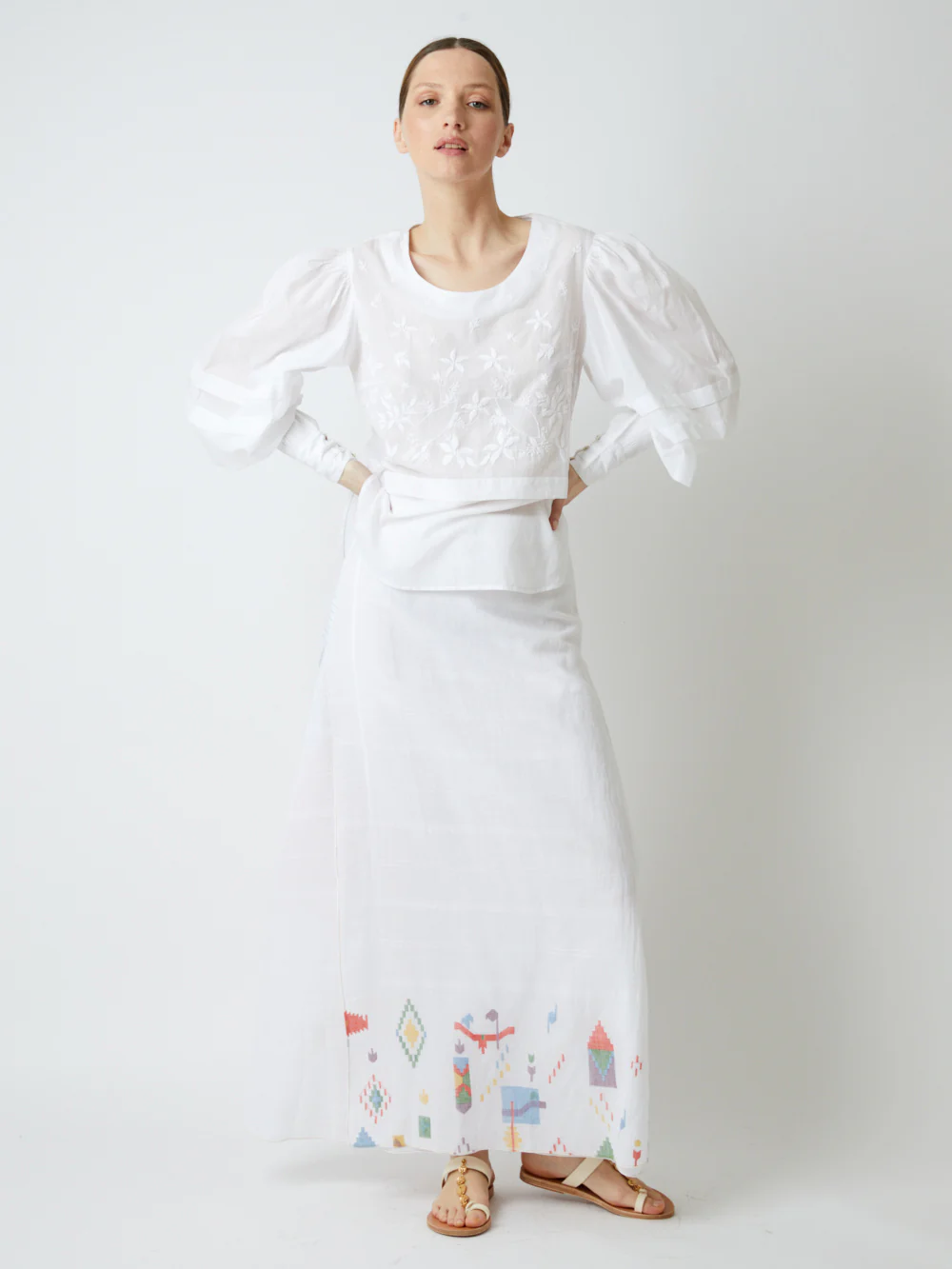 Jupe Thea signée Jane Gustavsson confectionnée en coton organique "Jamdani" tissé à la main. Une jupe longue à double épaisseur avec ouverture sur le côté.