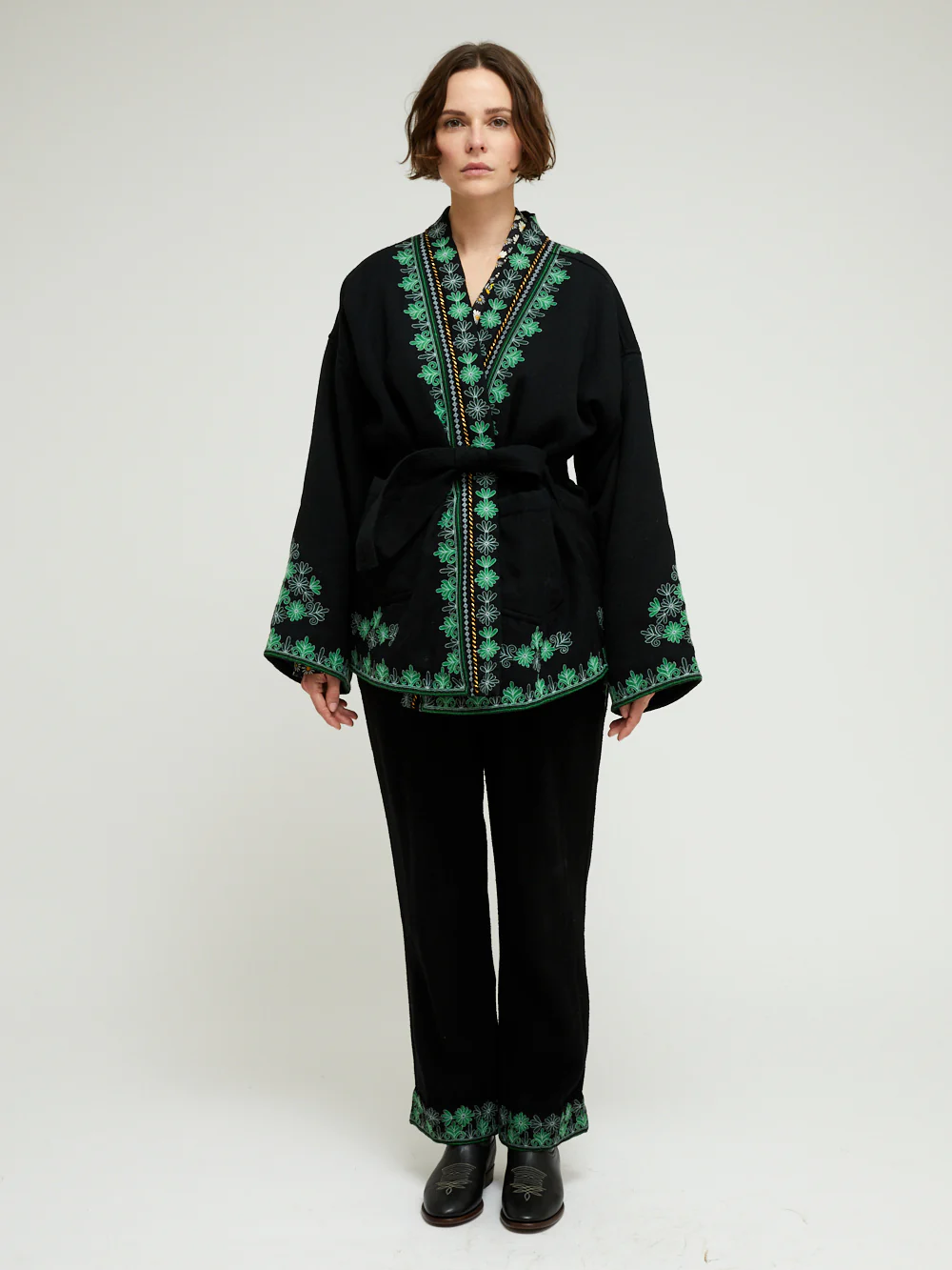 Kimono Forest signĂ© Monoki confectionnĂ© en coton noir dĂ©corĂ© de broderies dans les tons vert et blanc. Un modĂšle emblĂ©matique de la marque se fermant grĂące Ă une ceinture de kimono assortie noire.Â