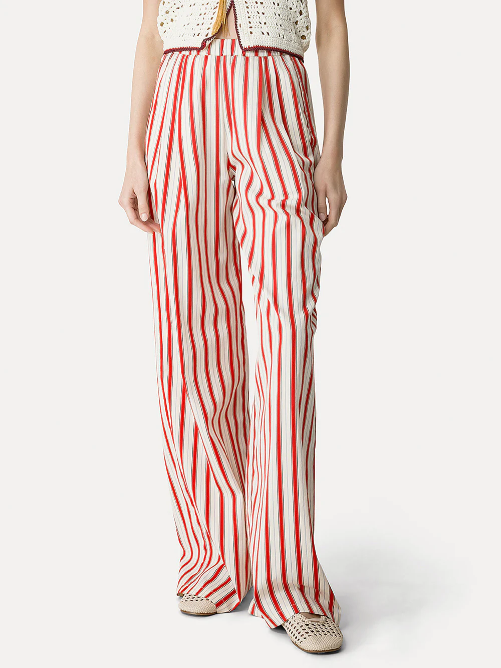 Pantalon Contemporary signĂ© Forte_Forte confectionnĂ© dans un mĂ©lange de coton et de soie aux rayures rouge et crĂšme. Une coupe palazzo taille haute au style inspirĂ© des pyjama.Â