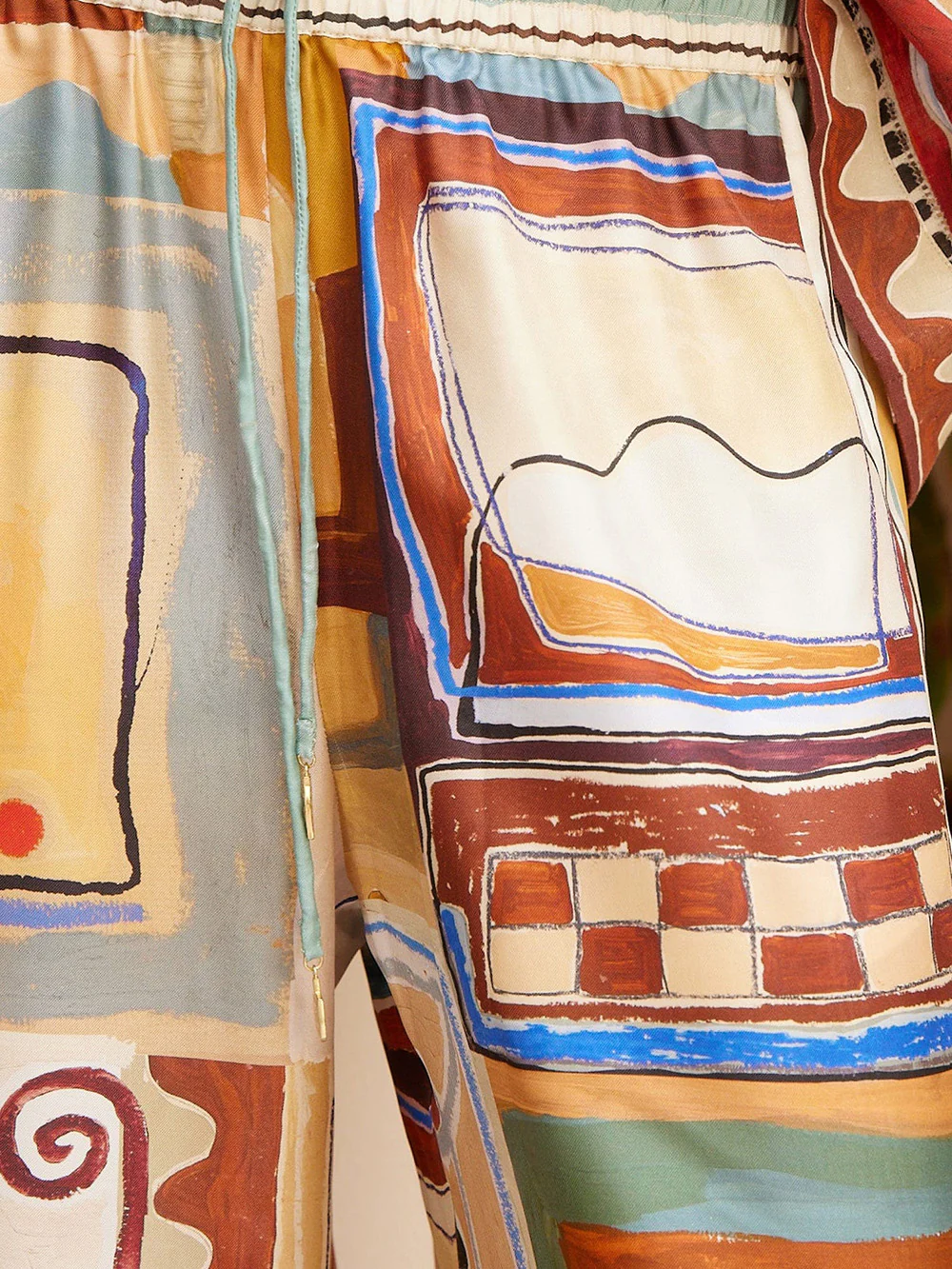 Pantalon Michelle signĂ© AlĂ©mais confectionnĂ© en soie imprimĂ© de motifs gĂ©omĂ©triques inspirĂ©s du Maroc dessinĂ©s par l'artiste Laurence Leenaert. Une pantalon large et fluide Ă la ceinture Ă©lastique.Â