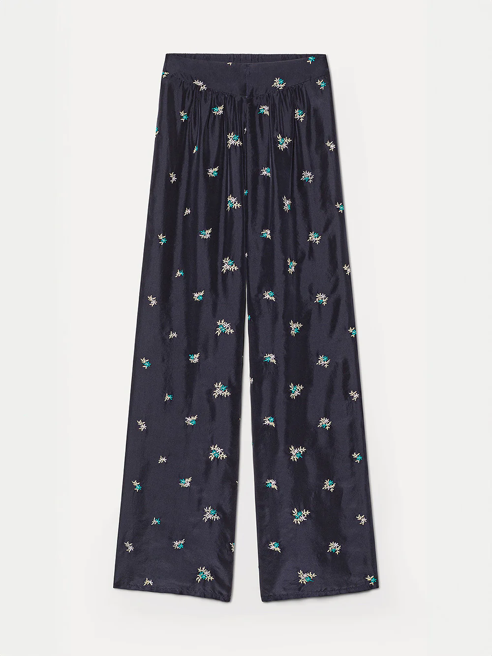 Pantalon Petites Fleurs signĂ© Forte_Forte confectionnĂ© en soie de couleur bleu nuit brodĂ©s de fleurs crĂšme et turquoise. Un patalon Ă la coupe inspirĂ©e du pyjama et Ă la taille marquĂ©e plissĂ©e.Â