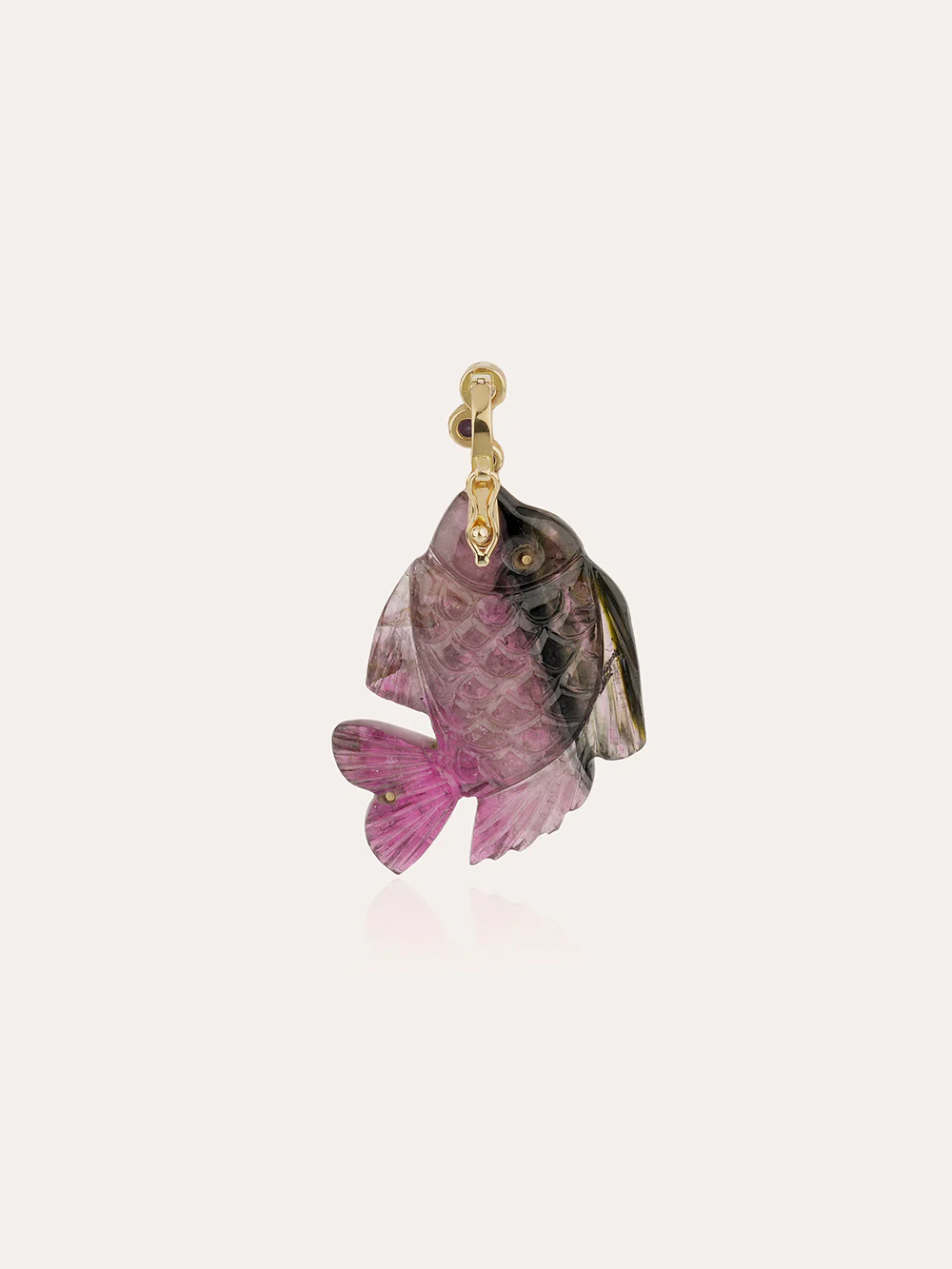 Pendentif Poisson Grand Modèle signé Violette Joaillerie confectionné en tourmaline aux reflets violet, rose et noir à la bélière en saphirs violet et rose imitant la forme de bulles. Une pièce unique.
