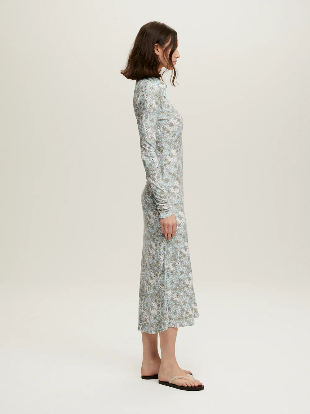 Robe Alice Monoki x BY Marie confectionnĂ©e dans un tissu stretch Ă l'imprimĂ© floral dans les tons bleu et gris. Une robe longue prĂšs du corps boutonnĂ©e sur le devant.Â