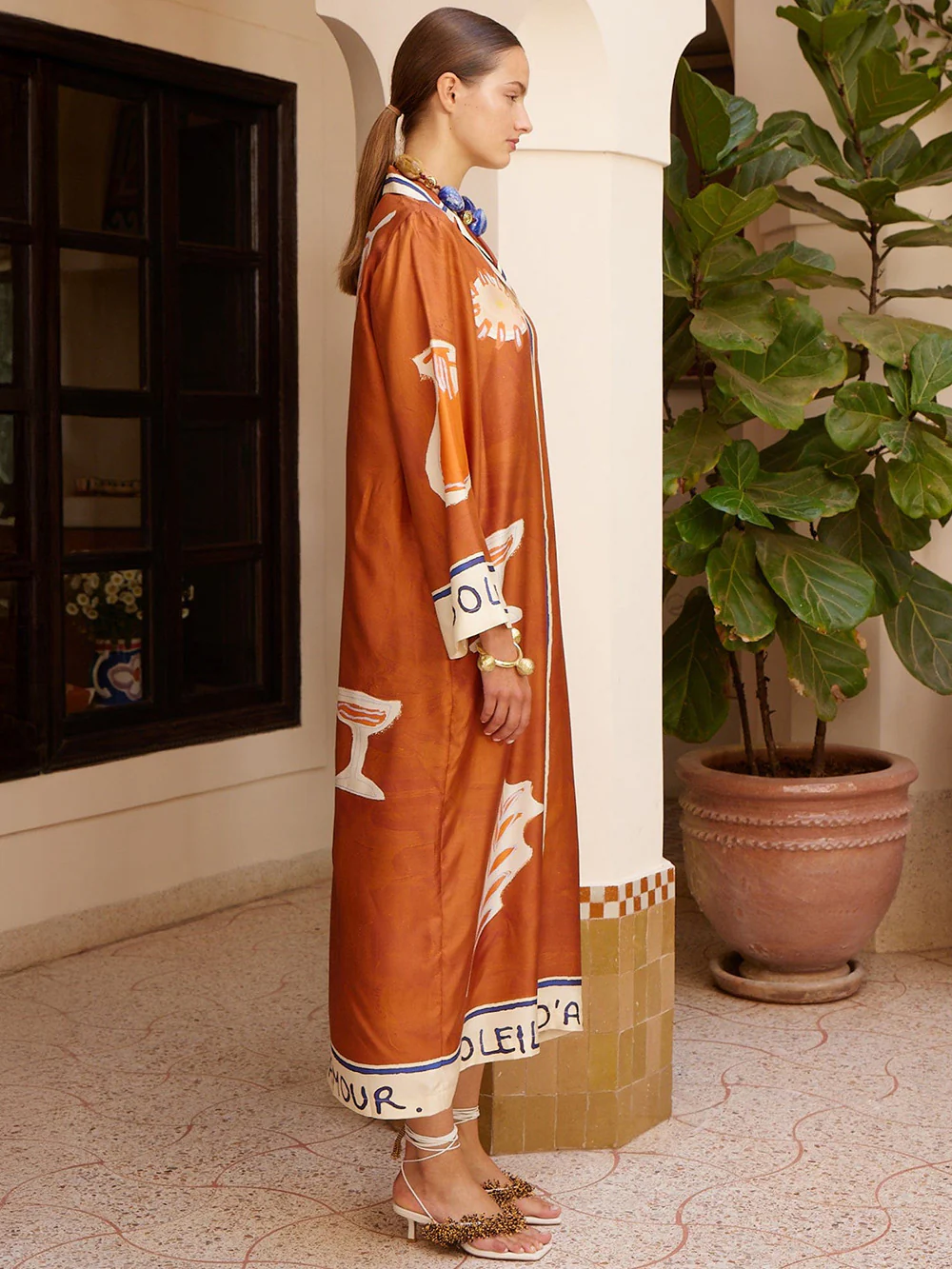 Robe Chemise Soleil d'Amour signée Alémais confectionnée en soie de couleur orange brulée. Une robe droite longueur midi aux manches longues le tout boutonné sur le devant. Bordures bleu marine accompagnées de l'inscription 'Soleil d'Amour'.