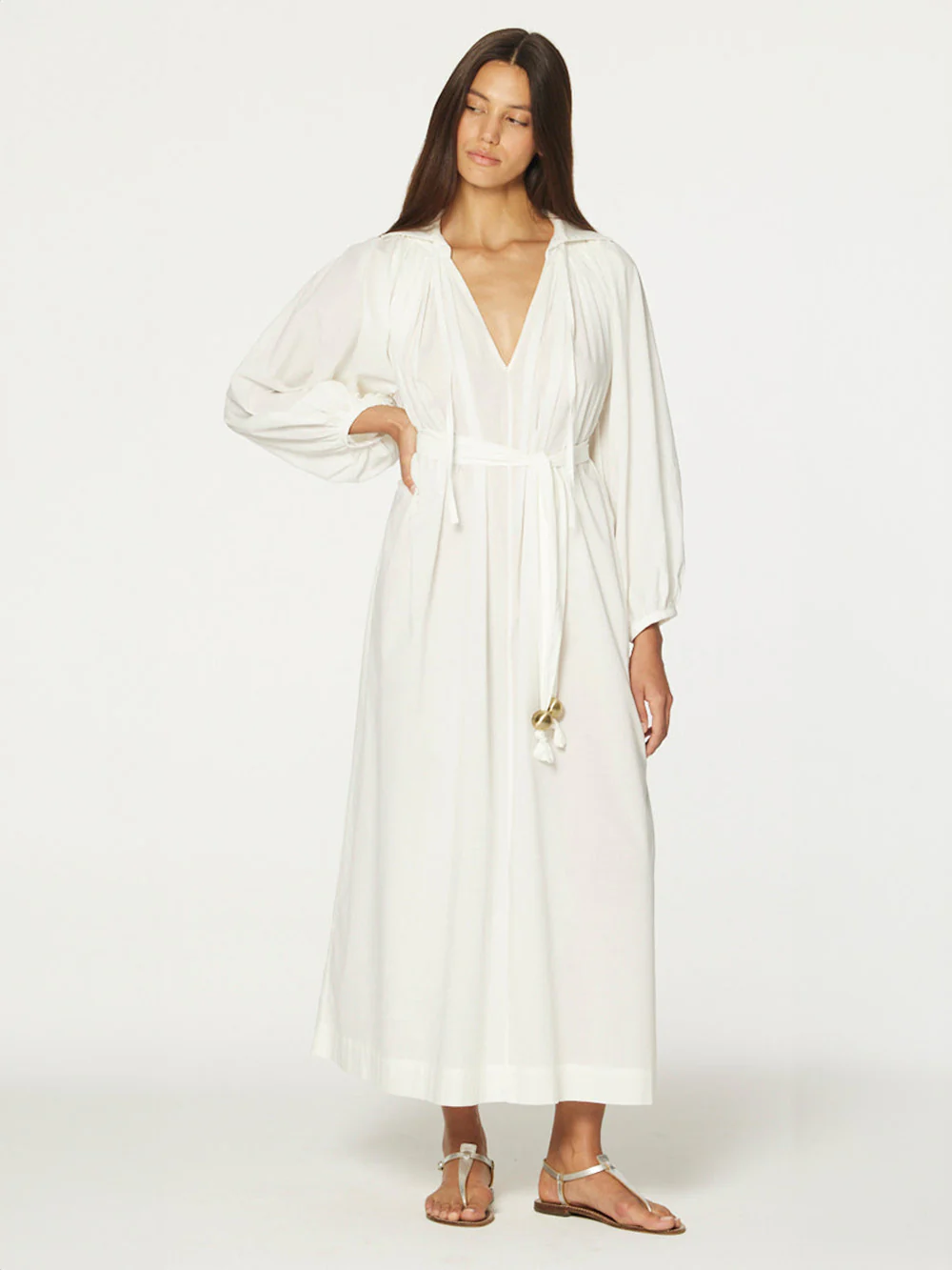 Robe Poet signée Lisa Marie Fernandez confectionnée en voile de coton de couleur crème. Une robe longue légère aux manches bouffantes et ajustable à la taille par une ceinture décorée de boules dorées.