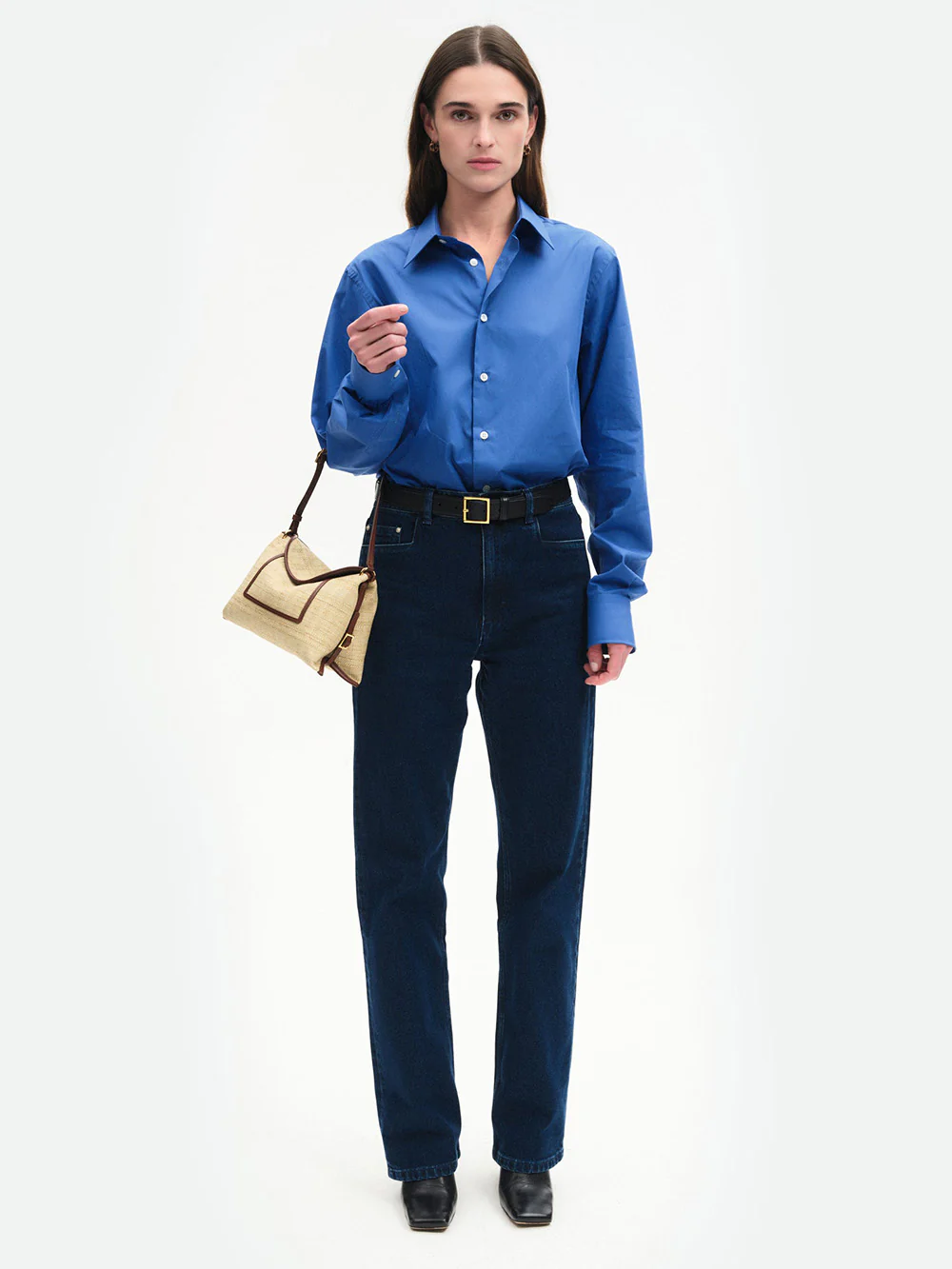 Sac Penelope Slouch signé Wandler confectionné en raphia naturel et aux bordures en cuir marron. Un sac pouvant se porter en bandoulière, à l'épaule ou à la main grâce à une sangle ajustable.