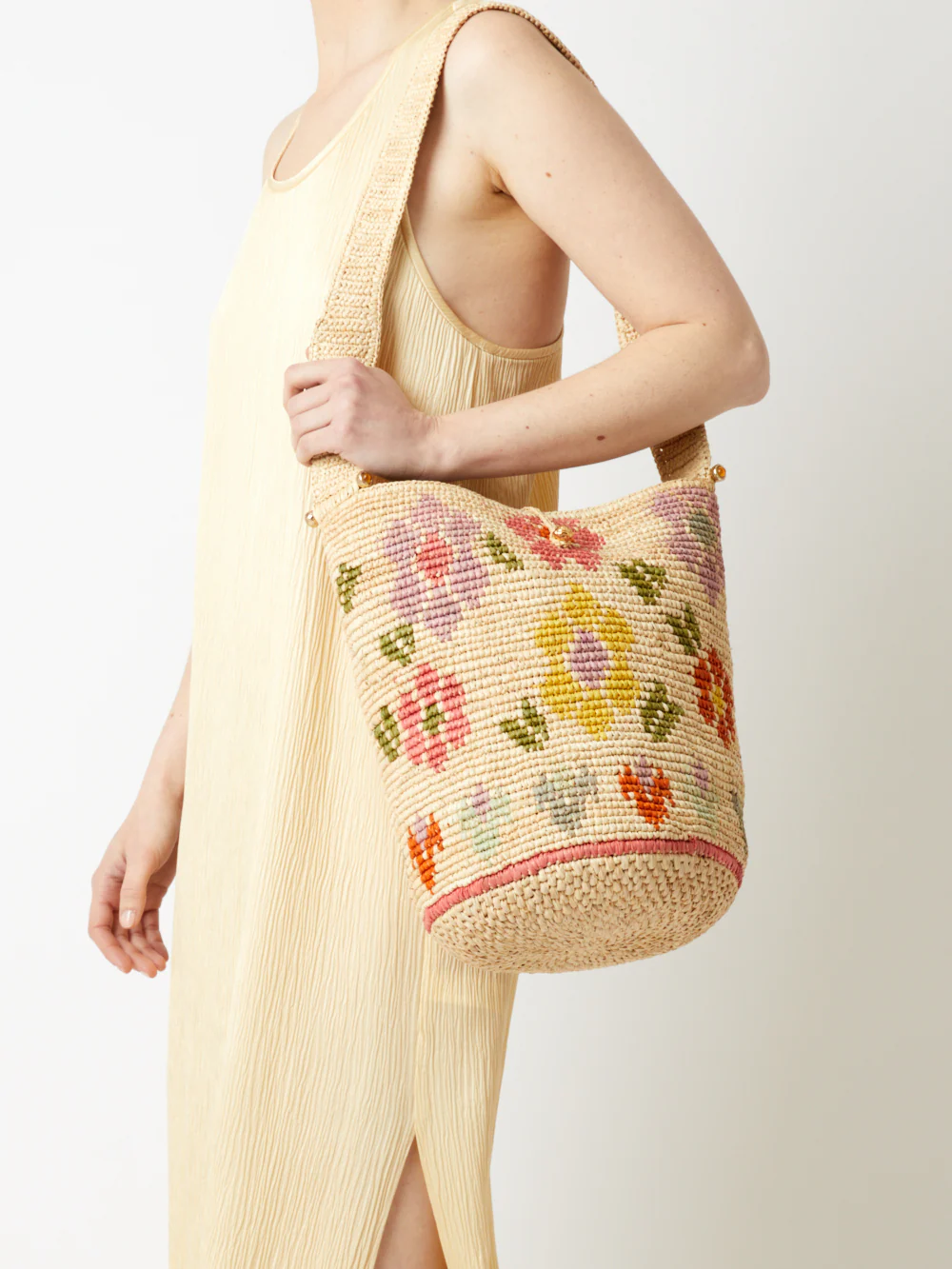 Le sac seau signé Gas Bijoux réalisé en raphia naturel teinté s'habille d'un nouvel imprimé floral et de barrettes ornées de pierres fines.