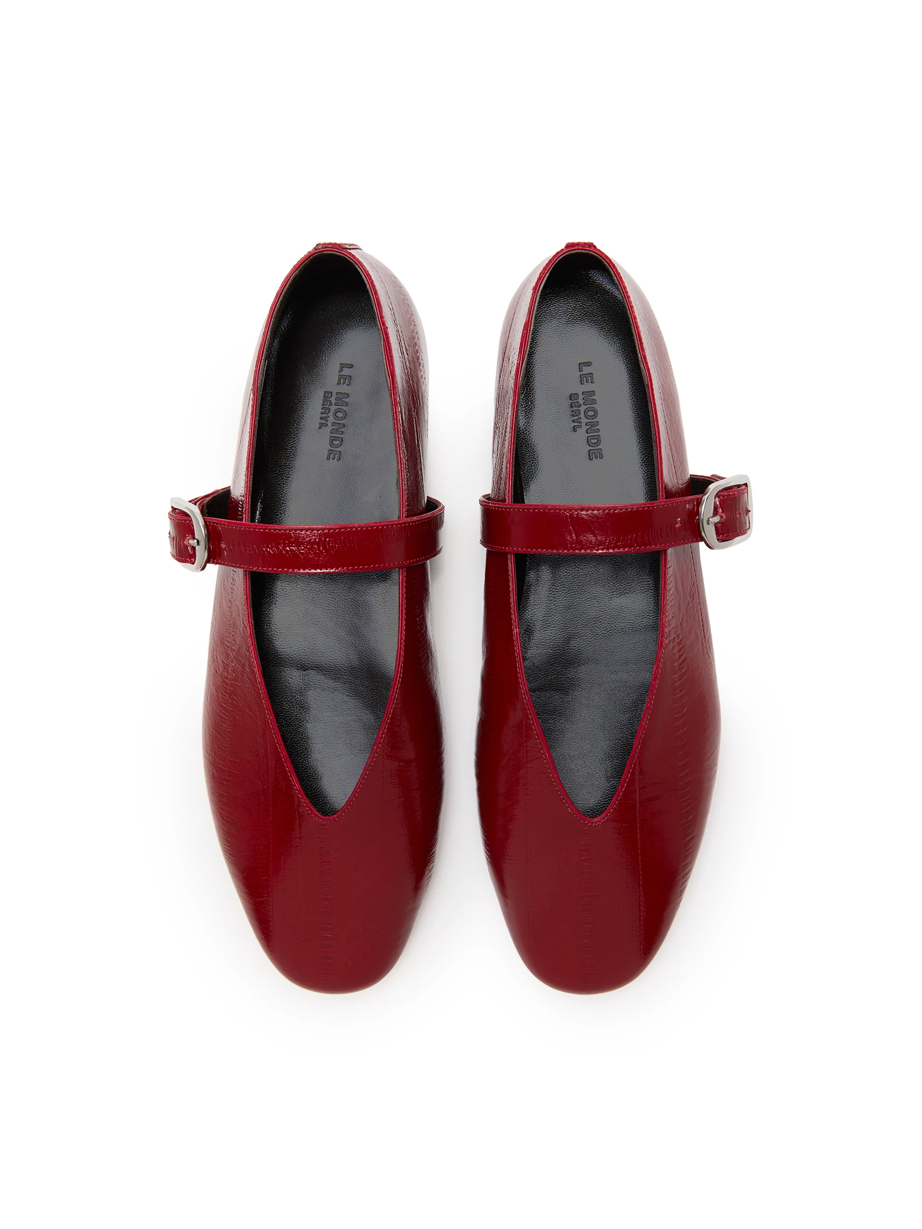 Ballerines Stella Oxblood signées Le Monde Beryl confectionnées en cuir de chèvre texturé de couleur rouge sang. Une paire de chaussure plate accompagnée d'une boucle pour maintenir le pied.