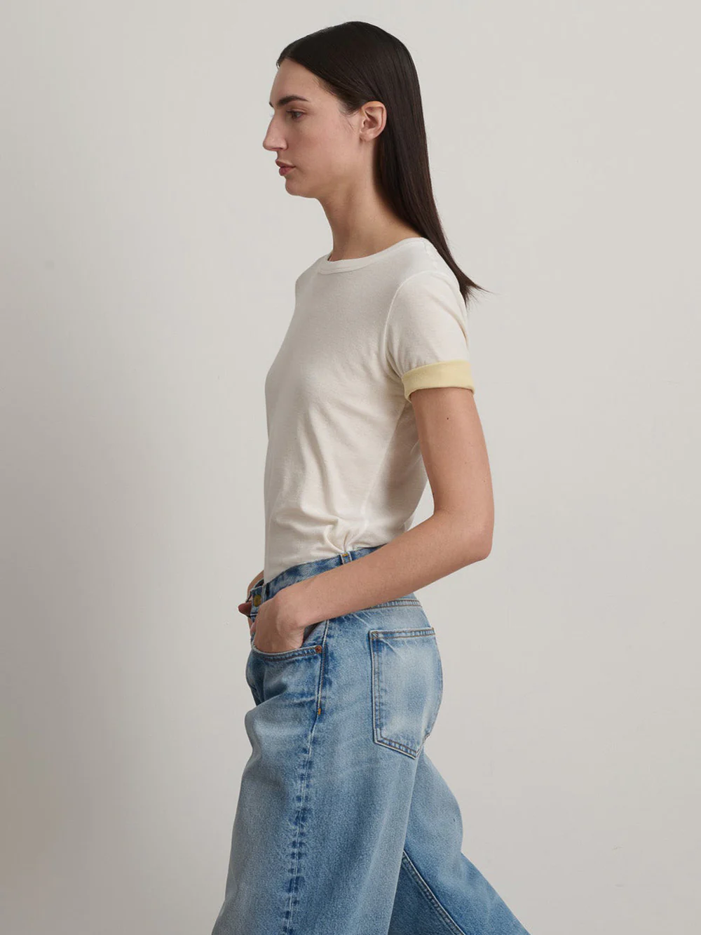 T-Shirt Double signĂ© B Sides confectionnĂ© en coton avec un cĂŽtĂ© blanc et un cĂŽtĂ© jaune pĂąle. Un T-shit Ă manches court rĂ©versible pouvant Ă©galement se porter avec les manches retroussĂ©es pour un contraste de couleur.Â