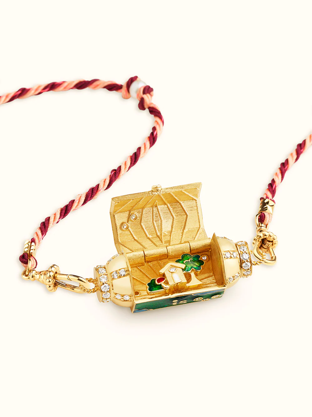 Le collier Home is Everywhere est réalisé par Marie Lichtenberg en or jaune 18 carats. Serti de diamants, le locket porte l'inscription "Home is Everywhere you are" et renferme une maison placée sur trembleuse avec un diamant au centre.